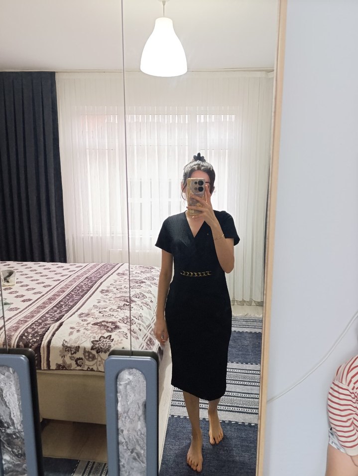Kemer Detaylı Siyah Midi V Yaka Elbise