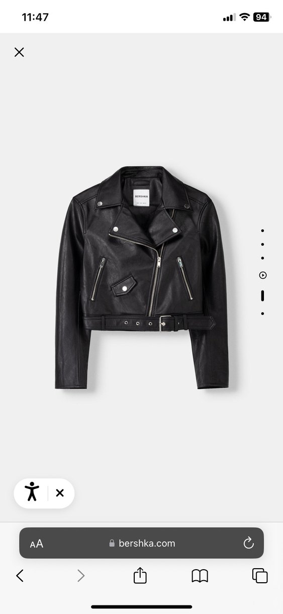 Parlak siyah deri biker ceket, kesik yakalı, kemerli ve uzun kollu, regular fit kesime sahip, gündelik kullanıma uygun.