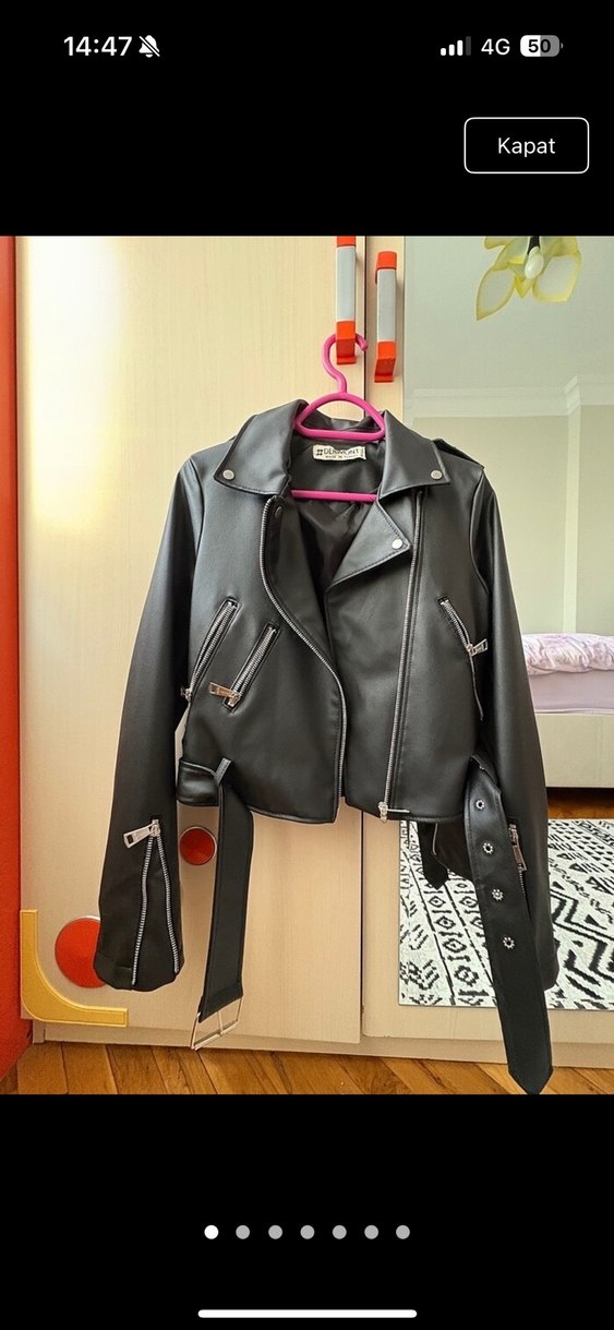 Bu siyah deri biker ceket, kemerli bel, kesik yaka ve askılı kollarıyla grunge punk tarzını yansıtıyor. Günlük kullanım için uygun.