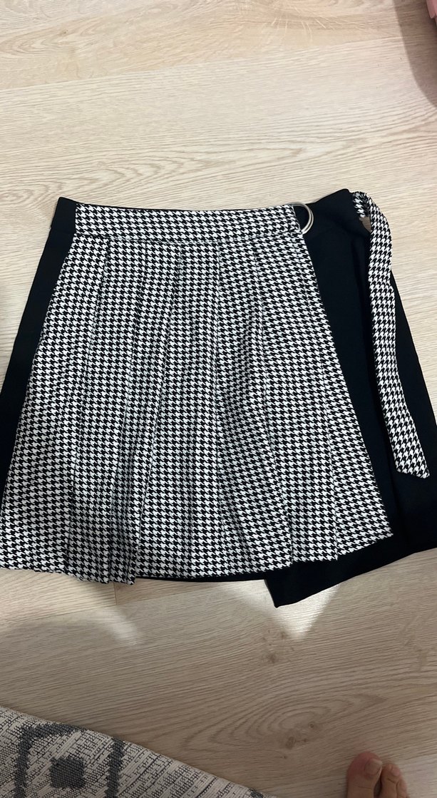 Kemer detaylı, siyah-beyaz desenli, sentetik kumaştan yapılmış dar kesim mini etek. Günlük şıklık için uygundur.