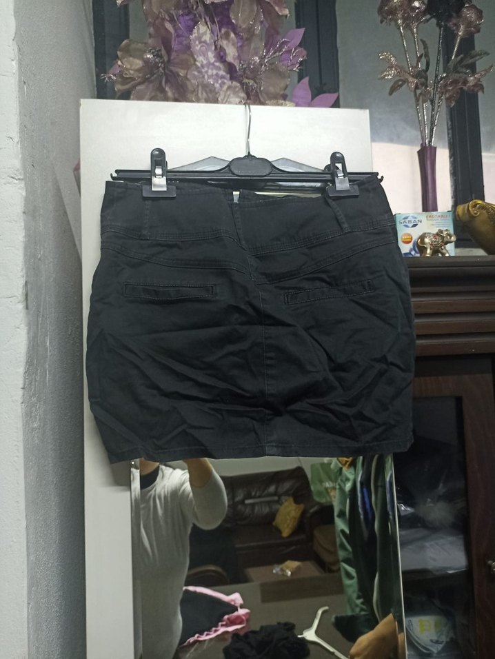 Kemer detaylı, sentetik kumaştan yapılmış, siyah ve dar kesim mini etek. Günlük ve sokak stiline uygundur.