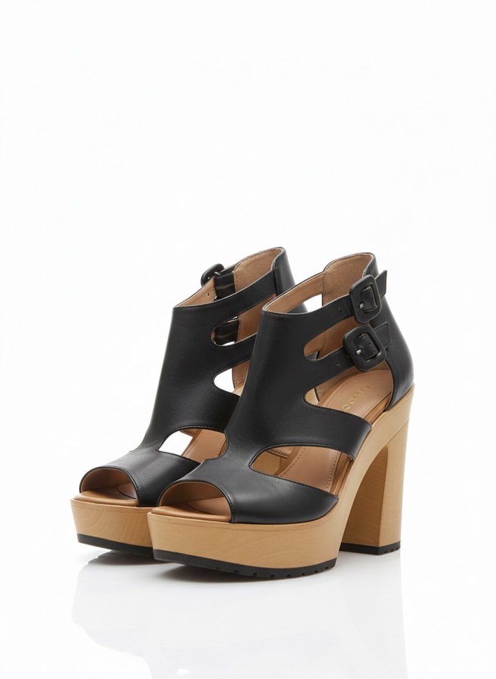 Bu cesur platform topuklu ayakkabılar, çift kemer detayı ve bej kauçuk tabanı ile siyah üst kısımdan oluşur. Ofis için modern bir görünüm sunar.