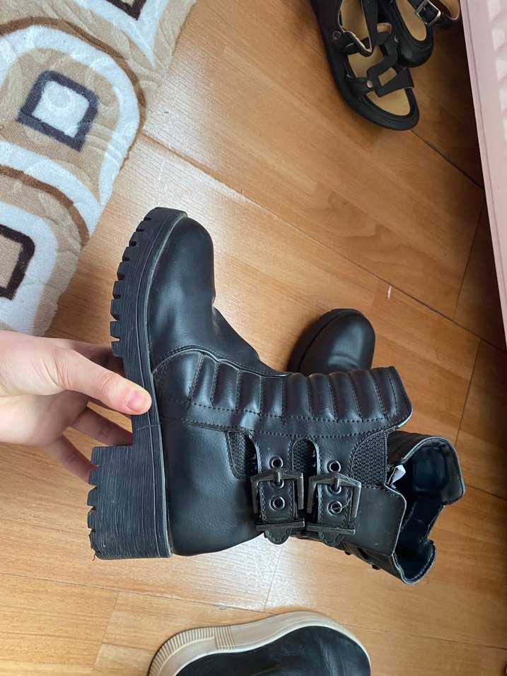 Siyah renkte, kemerli ve kalın topuklu kadın botu. Kauçuk malzemeden üretilmiştir, goth ve grunge punk tarzını yansıtır. Günlük kullanıma uygundur. kalıbı küçüktür bu yüzden 35 numara olarak girdim
