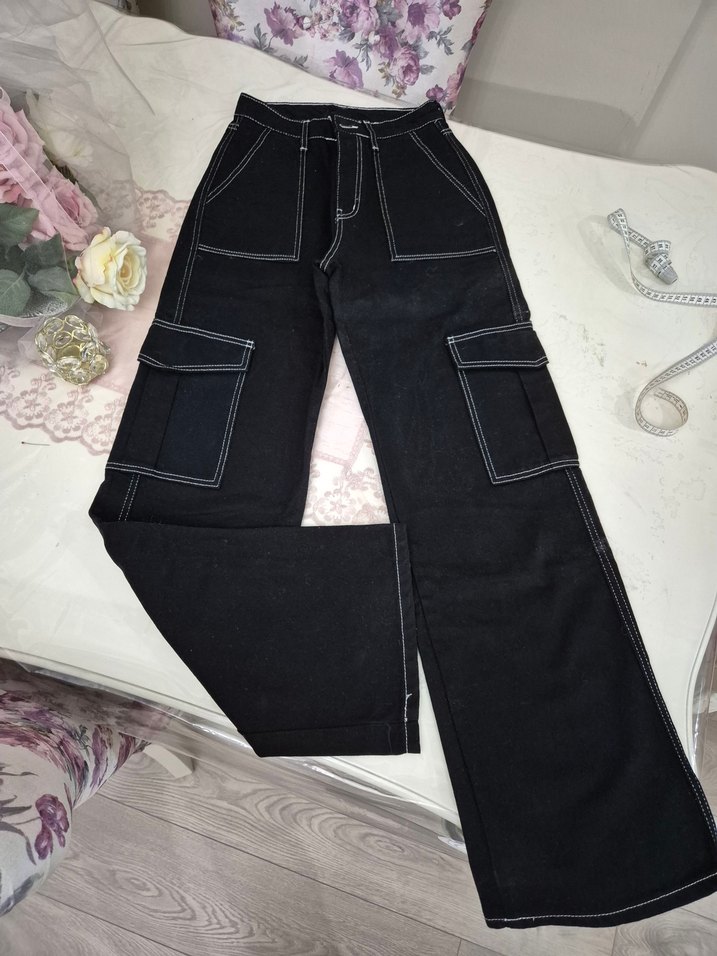 Kemer detaylı, salaş kesim siyah denim pantolon.büyük ceplerle günlük sokak stiline uygun.