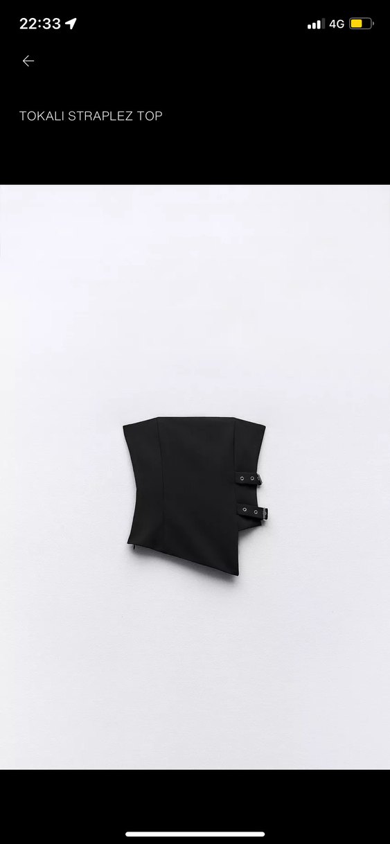 Siyah deri, kemerli ve straplez yaka detaylı, kısa ve fitted kesim büstiyer. Minimalist gotik tarzda şık bir parça. Hiç kullanmadım tam XS beden için. XS-S arasına olmaz diye düşünüyorum. Etiketlidir