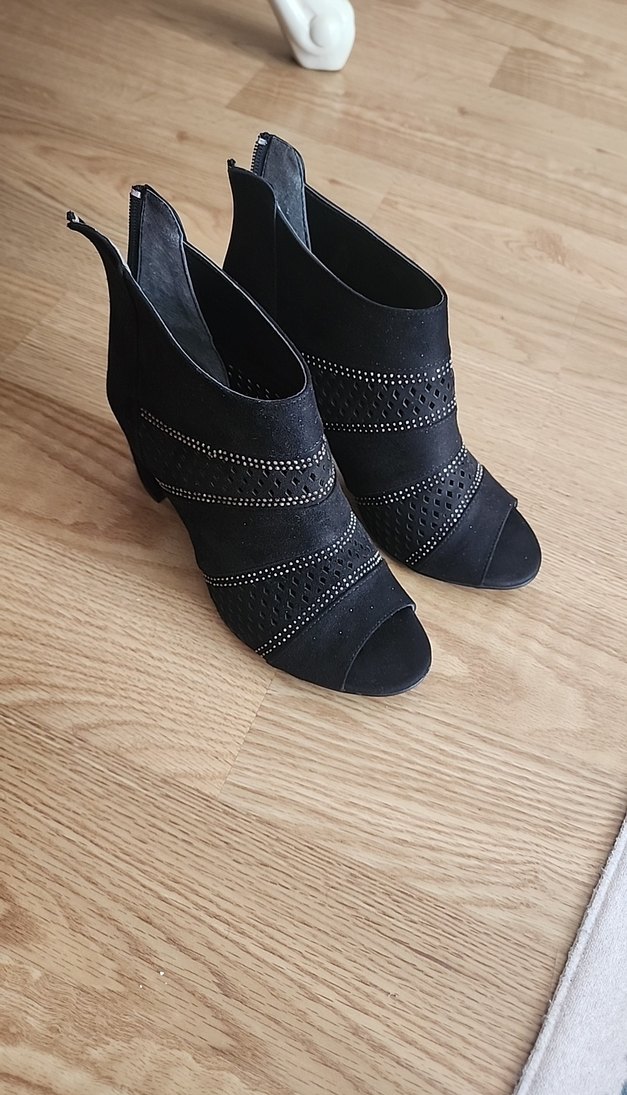 Kemer detaylı, yılan desenli siyah süet dolgu topuklu ayakkabılar, trendi ve rahat bir tarz sunar. Romantik akşamlar için uygundur.