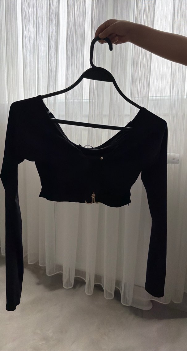 Kemer detaylı, siyah süet kumaştan yapılmış, V yakalı ve uzun kollu, gotik tarzda, midi boyda dar kesim bluz.