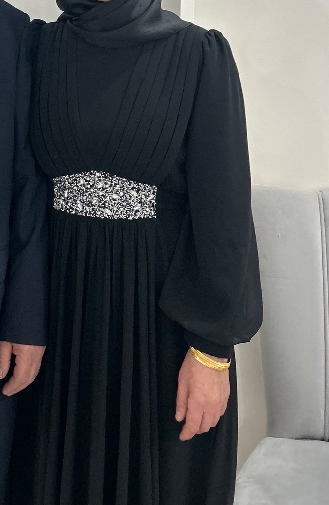 Kemer Detaylı Siyah Uzun Abiye Elbise
