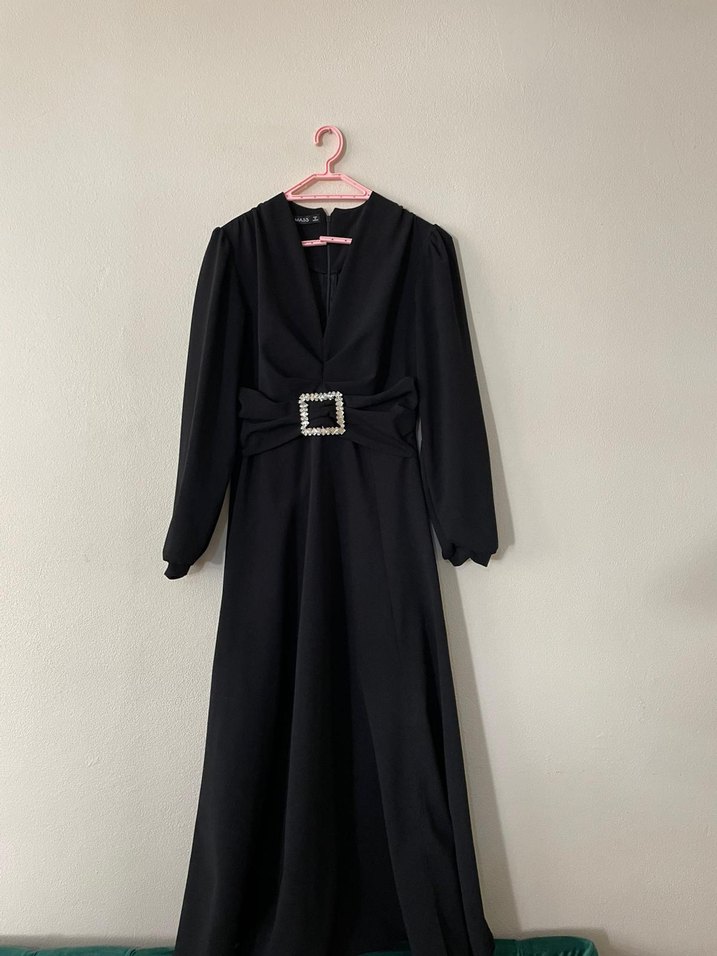Siyah uzun elbise, uzun kollu, V yakalı ve kemer detaylıdır. Klasik ve şık bir duruş sunar.