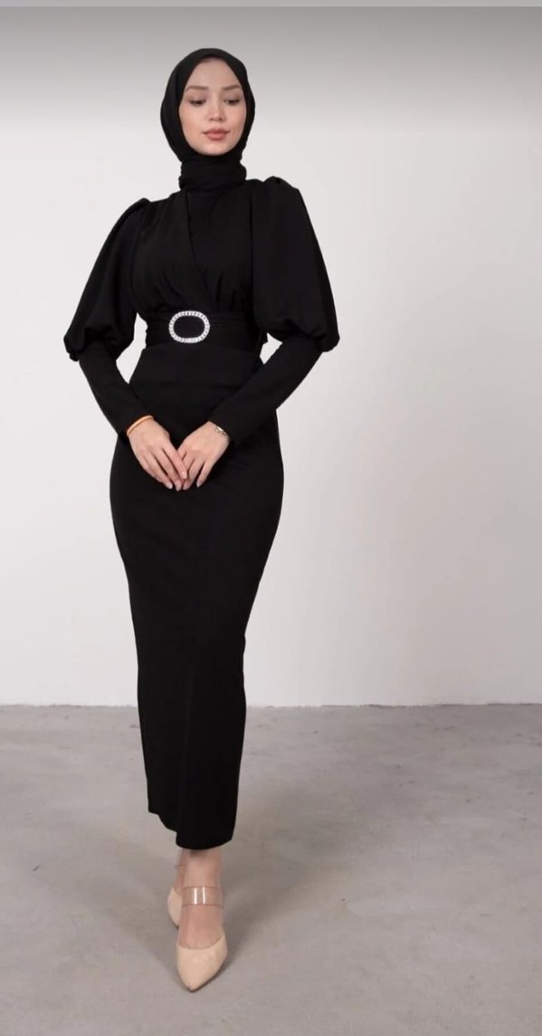 Kemer detaylı, yüksek yakalı ve uzun kollu siyah uzun elbise. Pürüzsüz sentetik kumaştan, şık bir model.