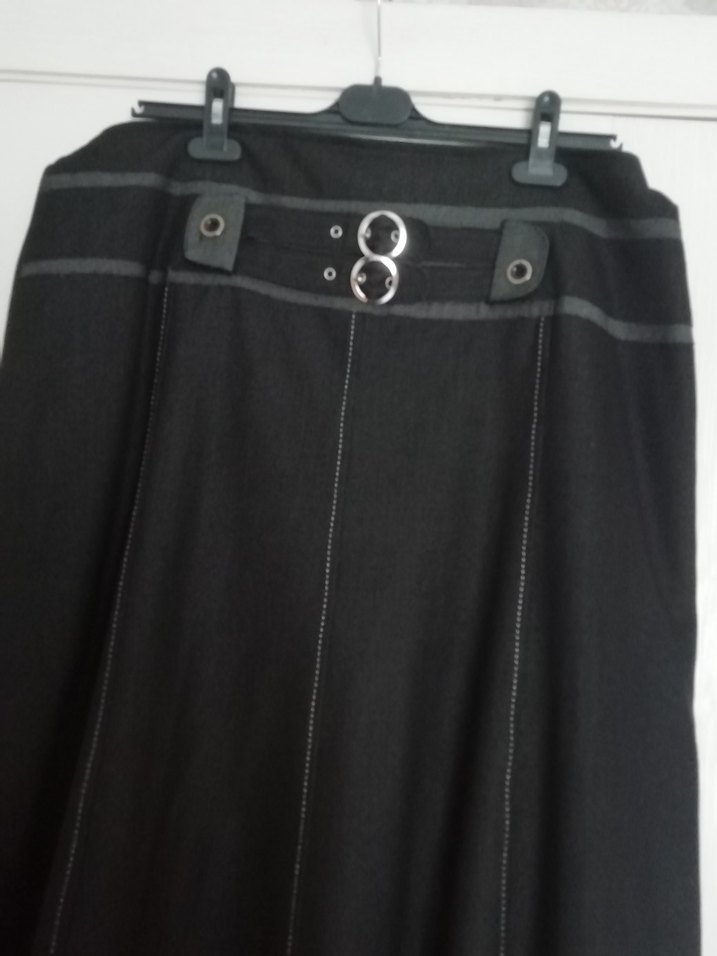 Kemerli bel detayı ve çift tokası olan siyah uzun etek, sentetik kumaştan, bol kesimle gotik tarzı yansıtır.