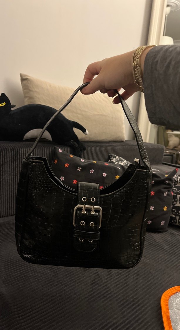 Siyah deri, kemerli ve yılan derisi desenli kadın çantası. Parisli gotik tarzını yansıtan, günlük kullanıma uygun şık bir model.