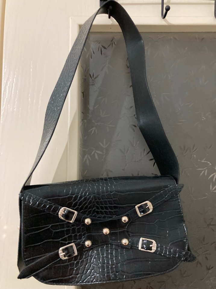 Kemer Detaylı Siyah Yılan Desenli Deri Çanta