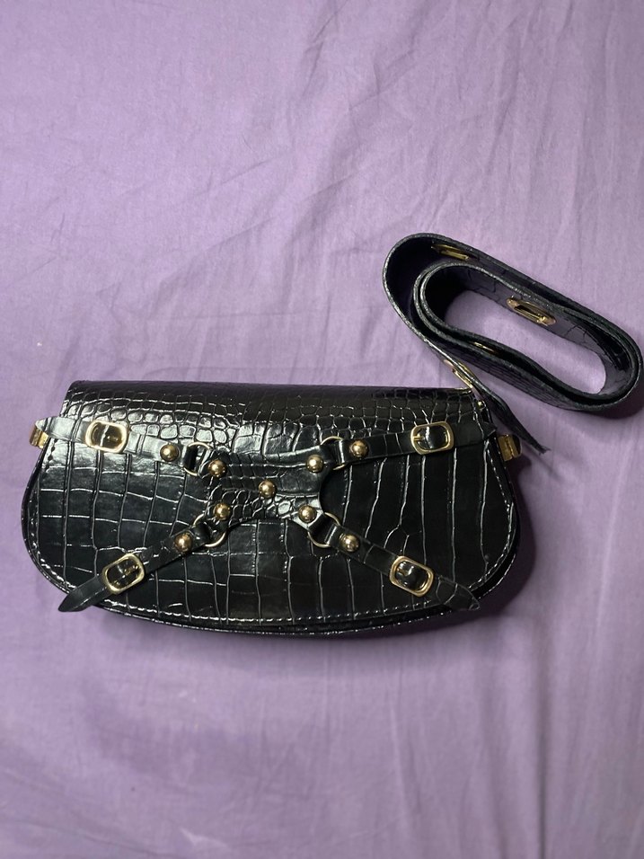 Siyah yılan desenli deri çanta, kemerli askıları ve gotik tarzıyla günlük kullanıma uygun