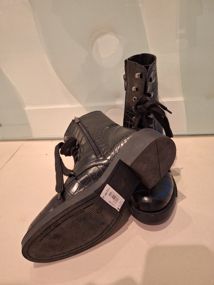 Siyah yılan desenli, kemerli gotik kadın botları, Paris tarzını yansıtan detaylarla tamamlanmıştır.