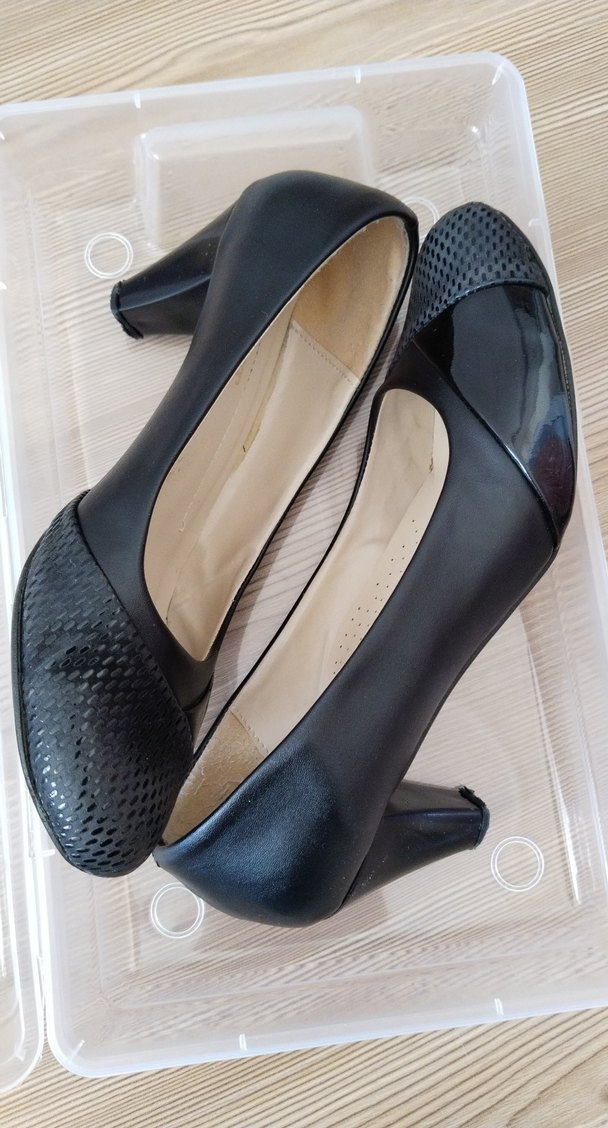 Kemer detaylı, yılan desenli siyah topuklu ayakkabılar, iş ortamı için klasik ve geleneksel stile uygundur.