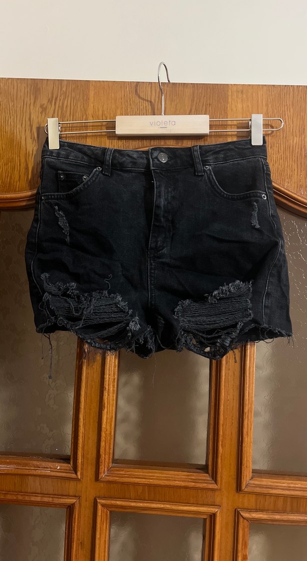 Siyah kot mini şort, bol kesim ve kemer detaylı, yırtık efektleriyle grunge punk tarzında. Günlük sokak stiline uygun.