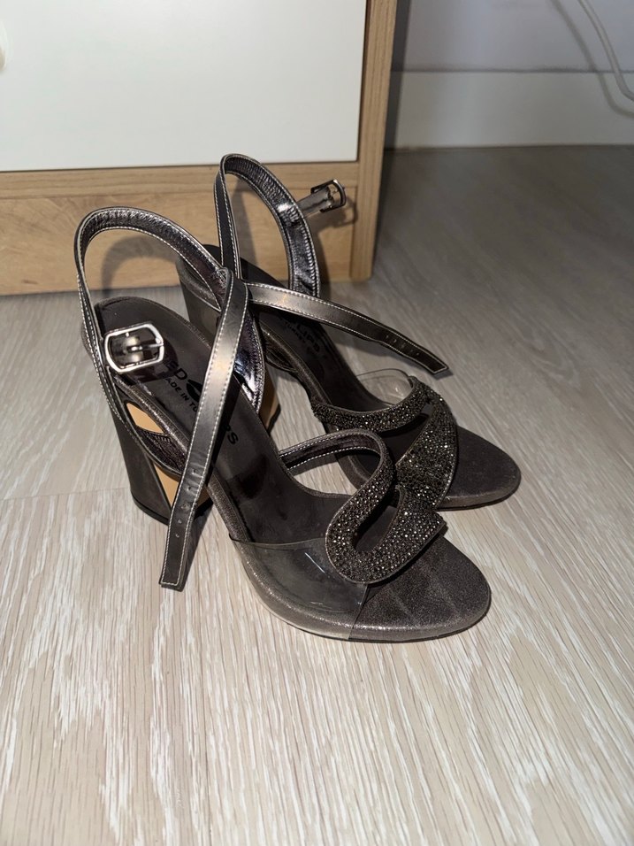 Kemerli, yüksek topuklu, platin tonlarında gece ayakkabısı, romantik akşamlar için uygun. Sadece 1 kez giyildi. Marka temsilidir.