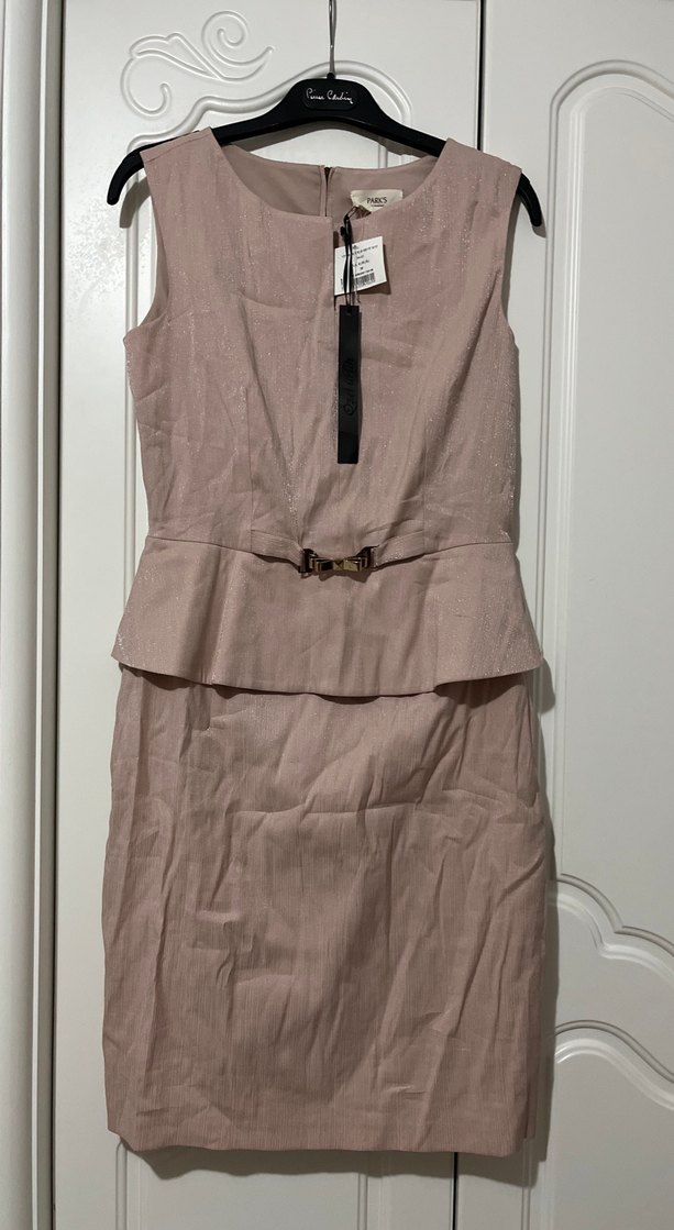 Toz pembe rengi, kemerli ve kolsuz midi elbise. Notlu yaka ve düzenli kesimle modern klasik tarzda, ofis için uygun. Resimde ışıktan dolayı rengi belli olmadı toz pembe rengindedir