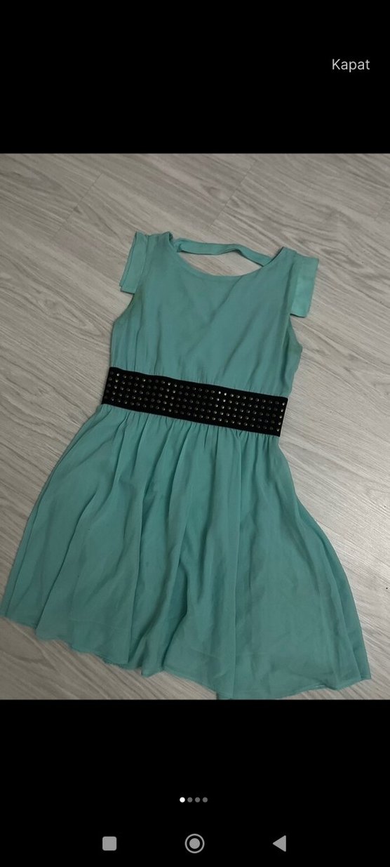 Kemer detaylı, turkuaz renkli, kolsuz ve belden oturan kız elbisesi, yumuşak sentetik kumaştan üretilmiştir. fiyat temsili pazarlık payı vardır
