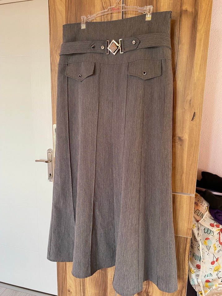 Kemer detaylı, rahat kesimli uzun gri keten etek. Vintage ve normcore stil, ofis kullanımı için uygun, desensiz tasarım.