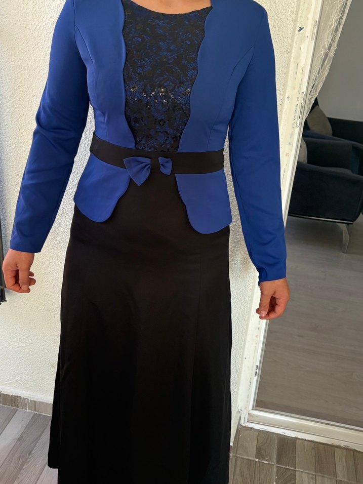 Lacivert uzun kol ve kemer detaylı, klasik şıklıkta kadın elbise. 38 40 beden uyumlu 1 kere giyildi