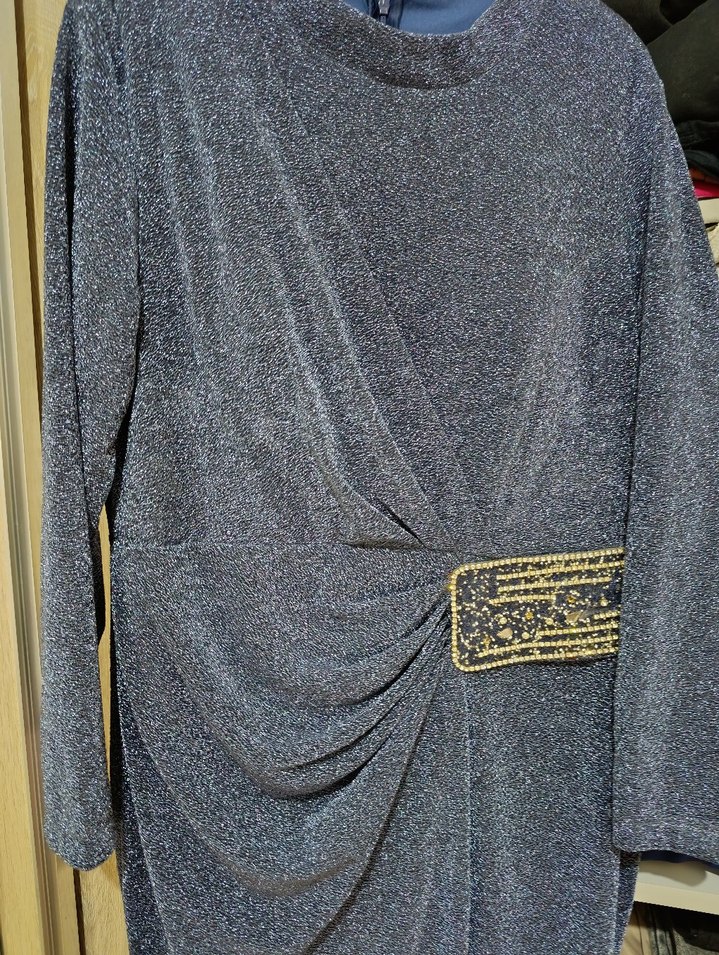 Uzun mavi abiye elbise, yüksek yakalı ve askılı kollu. Kemer detayı ve koyu yılan desenli, düğün ve şık sokak stili için uygun. 1 kez giyildi 44/52 beden uyumlu