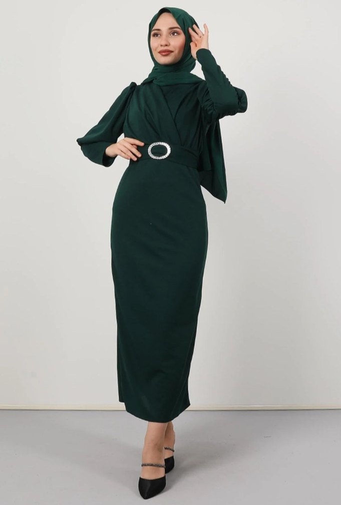 Kemer detaylı, uzun ve fitted kesim yeşil elbise. Yüksek yaka ve uzun kollu, kemerindeki süs yok . şalı içinde konusabiliriz .38-40 beden uyumlu