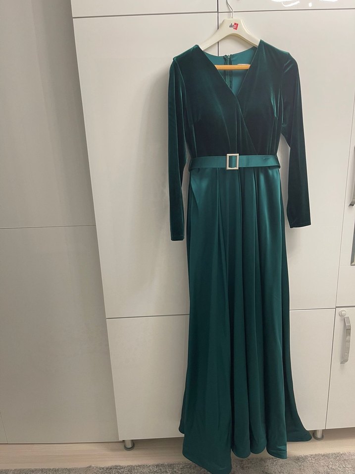 Kemer detaylı, V yakalı ve uzun kollu bu uzun yeşil elbise, klasik ve modern kesimiyle düğünler için uygundur.