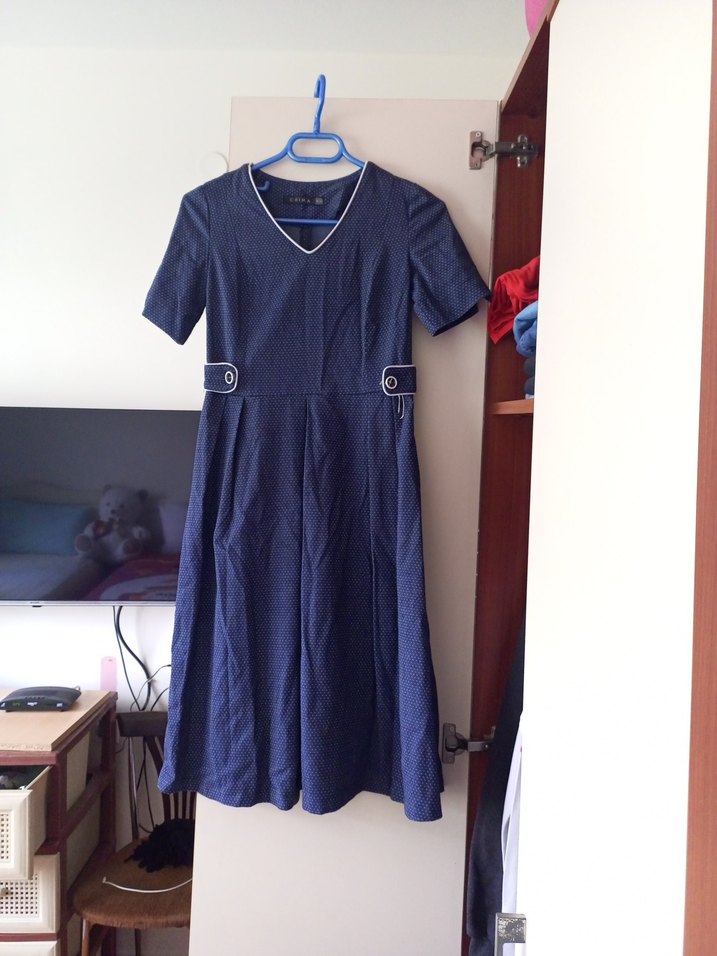 Kemer detaylı, V yakalı midi kot elbise. Kısa kollu ve regular fit yapısıyla günlük sokak stiline uygun, lacivert renkte sade bir tasarım.