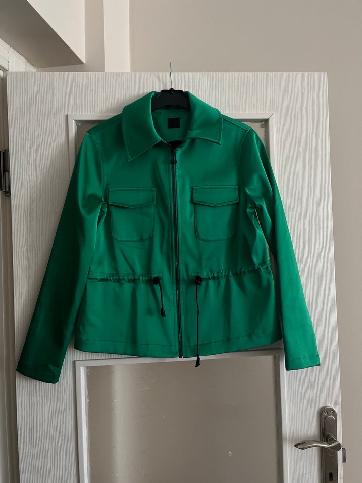 Yeşil deri ceket, kemerli bel, uzun kollu ve kesik yaka detaylarıyla sokak modasına uygun kısa kesimdir. Günlük kullanım için idealdir.