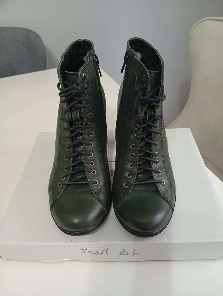 Yeşil deri kadın botlar, dolgu topuk ve kemer detayına sahiptir. Bağcıklı ve yan fermuarlı, günlük şık sokak stiline uygun. içinde bazı yerleri dökülüyor başka sorunu yok yandan fermuarlı 39numara yazılmış 37numaraya olur