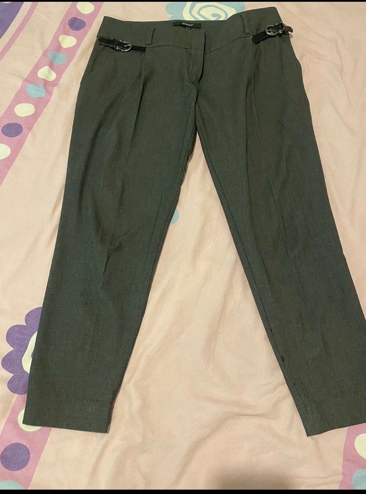 Kemer detaylı, midi boy, regular fit yeşil kadın kumaş pantolon. Ofis ve sokak stili için uygundur.