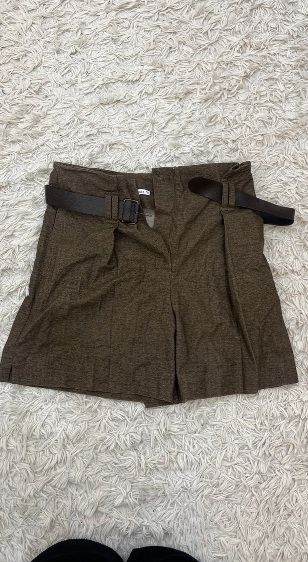 Yumuşak keten kumaştan, kemerli ve bol kesim kahverengi yüksek bel kadın şort, günlük rahat kullanıma uygundur.