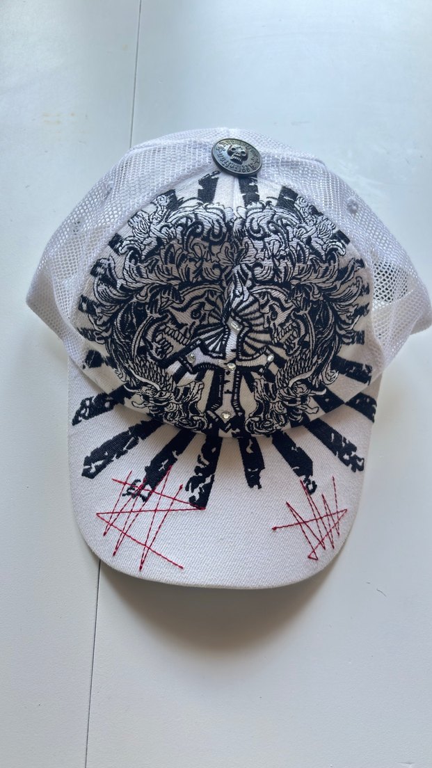 Sentetik kumaştan yapılmış, koyu punk desenli beyaz kadın şapkası. Kemer tokası ve kafatası ile haç figürleri bulunur. ⚡