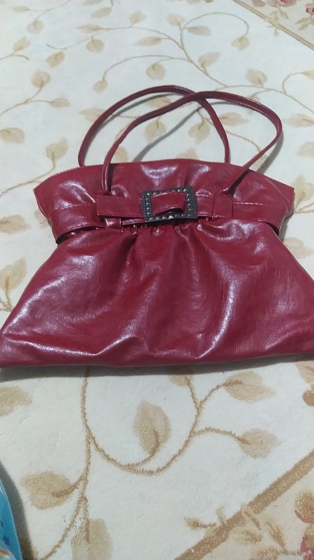 Parlak bordo deri kadın çanta, kemer tokası detaylıdır. İnce saplı, desensiz tasarımı Paris tarzı karşı kültürü yansıtır.