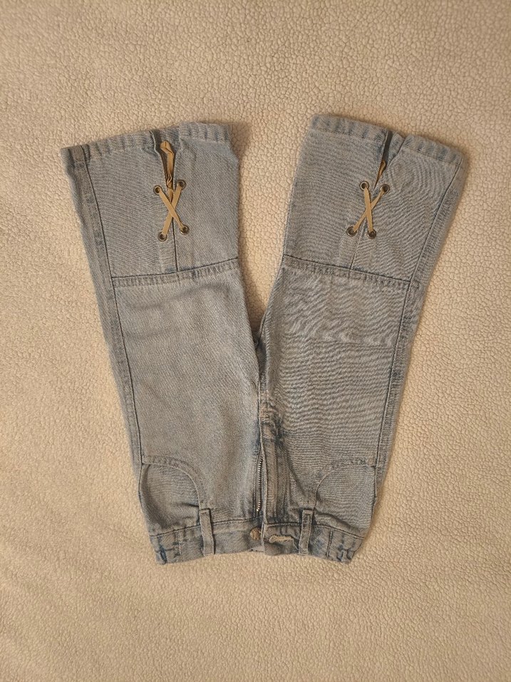 Tokalı detaylara sahip, sokak modası tarzında gri renkli kız kot pantolon, dar kesim ve retro görünüm sunar. temiz kullanıldı