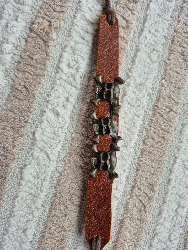 Kahverengi deri kemer tokalı bileklik, işleme detaylı ve metal kafatası süslemelidir. Günlük kullanıma uygun punk ve bohem tarzına hitap eder.