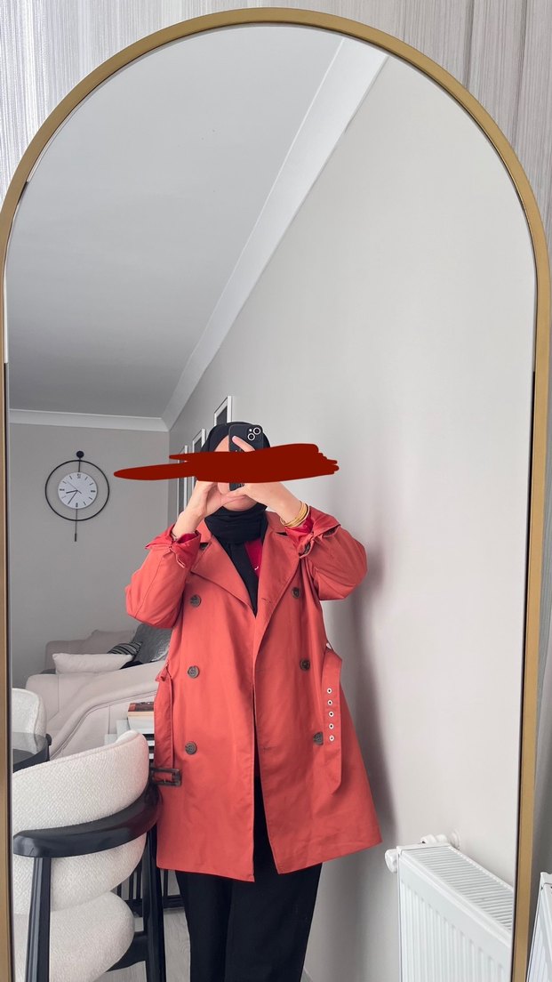 Kemer tokalı, kırmızı midi trençkot. Notlu yaka ve uzun kollu, bol kesim. Günlük sokak stili için uygun, sentetik kumaştan.