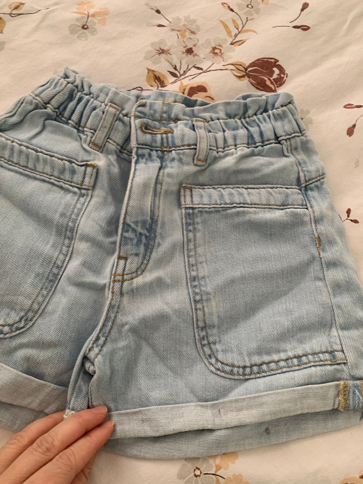 Kemer tokalı, bol kesim kız denim şort. Pastel tonlarında, büyük ön cepler ve katlı paça detayıyla rahat ve şık.