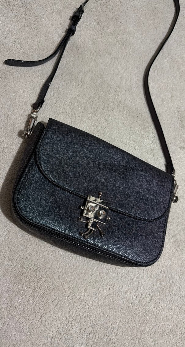 Parlak deri kadın çanta, kemerli tokası ve baskılı deseniyle gotik ve Parisli rock punk tarzını günlük kullanıma yansıtıyor.
