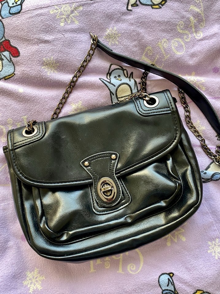 Kemer tokalı kapak ve zincir askılı siyah deri çanta, gotik Paris tarzını klasik zarafetle buluşturur. Günlük kullanıma uygundur.