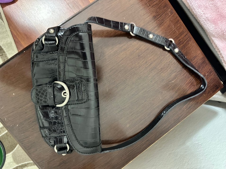 Kemer tokalı, siyah deri kadın çantası, yılan derisi dokusu ve gotik Paris tarzını yansıtıyor.