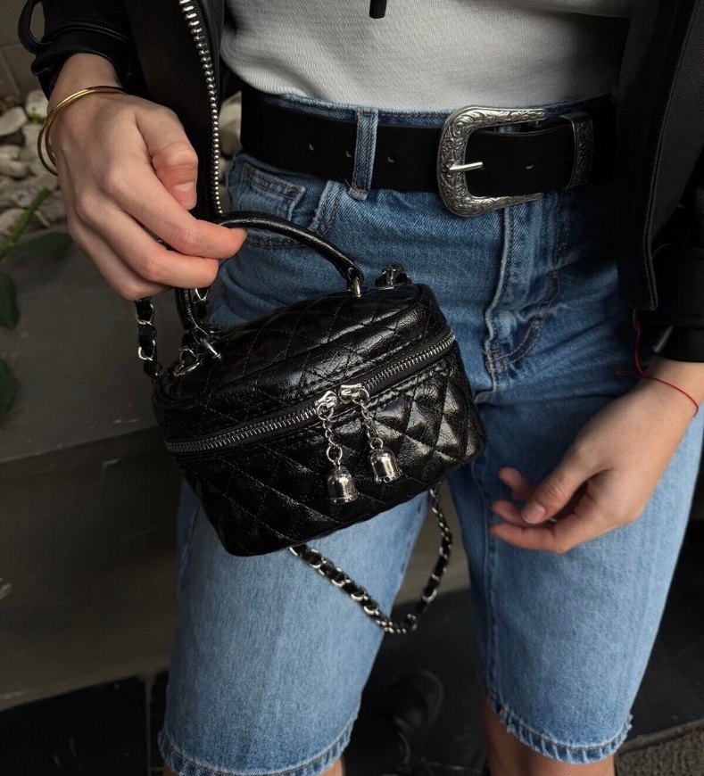 Siyah deri, yılan deseni ve kemer tokası detaylı biker tarzı çanta, zincir saplı ve kapitone dokulu.