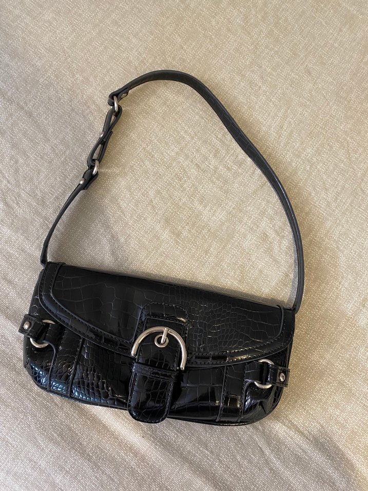 Kemer tokalı, siyah yılan desenli deri çanta, kısa askılı ve günlük kullanıma uygun.