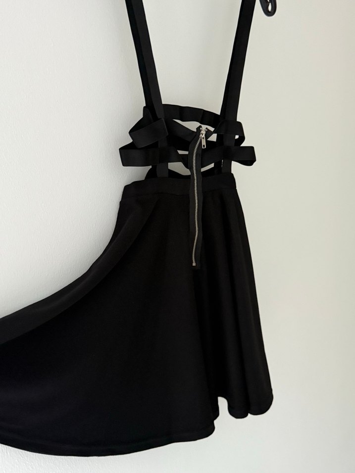 Siyah kemer ve askıdan oluşan tarz bir etek S bedendir esnekliği olan tok bir kumaştır içine gömlekle yada hoş bir badiyle çok tatlı duracaktır