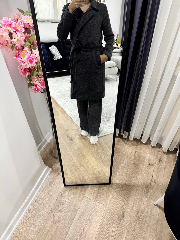 Kemerli ve yan cepli antrasit gri kaban,içi astarlı kaşe kaban.