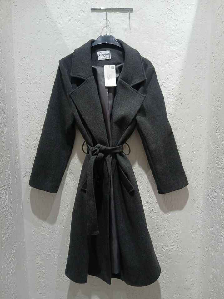 Kemerli bel ve antrasit renkli, yumuşak ve sıcak kumaştan yapılmış kadın kabanı. Klasik yaka ve uzun kolludur.