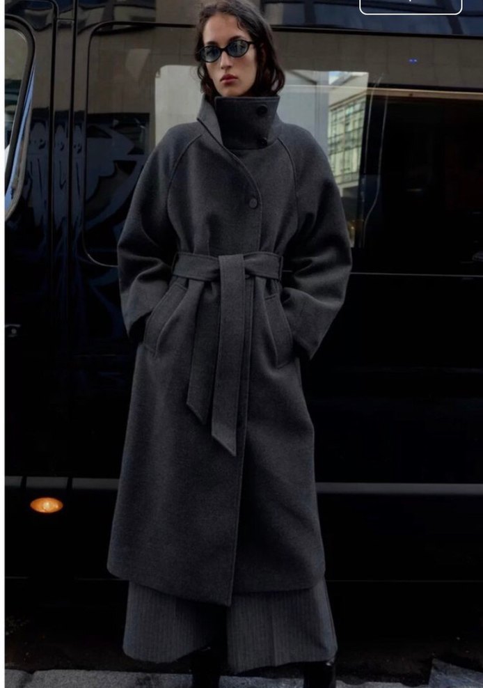 Yüksek yakalı, kemerli antrasit uzun kaban. Yan cepler ve düğmeli kapanış ile şıklık ve sıcaklık sağlar. M l uyumlu sorunsuz
