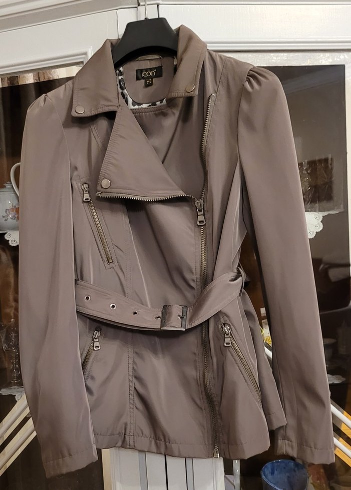 Kemerli ve fermuarlı cepleri olan bej deri trençkot, strappy kollu ve notched yakalıdır. Şehir stili için uygundur.